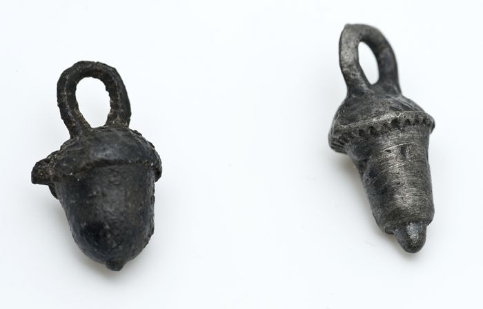 Twee bedels of hangers in de vorm van eikels, met ha...