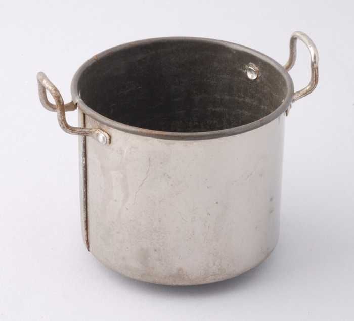 Geelkoperen miniatuur kookketel met drie roodkoperen...