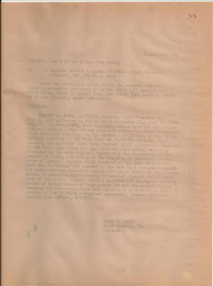 Brief van James Gavin betreffende Silver Star medal ...