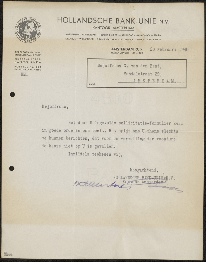 Afwijzing sollicitatie van Hollandsche Bank Unie Ams...
