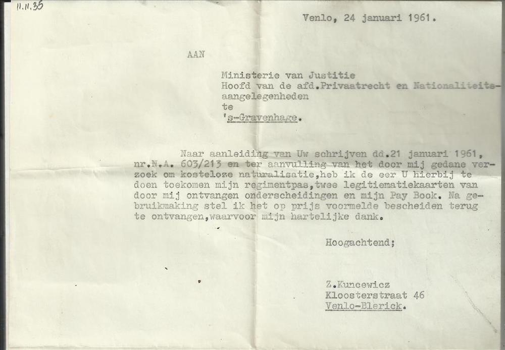 Een brief van Kuncewicz aan Ministerie van Justitie