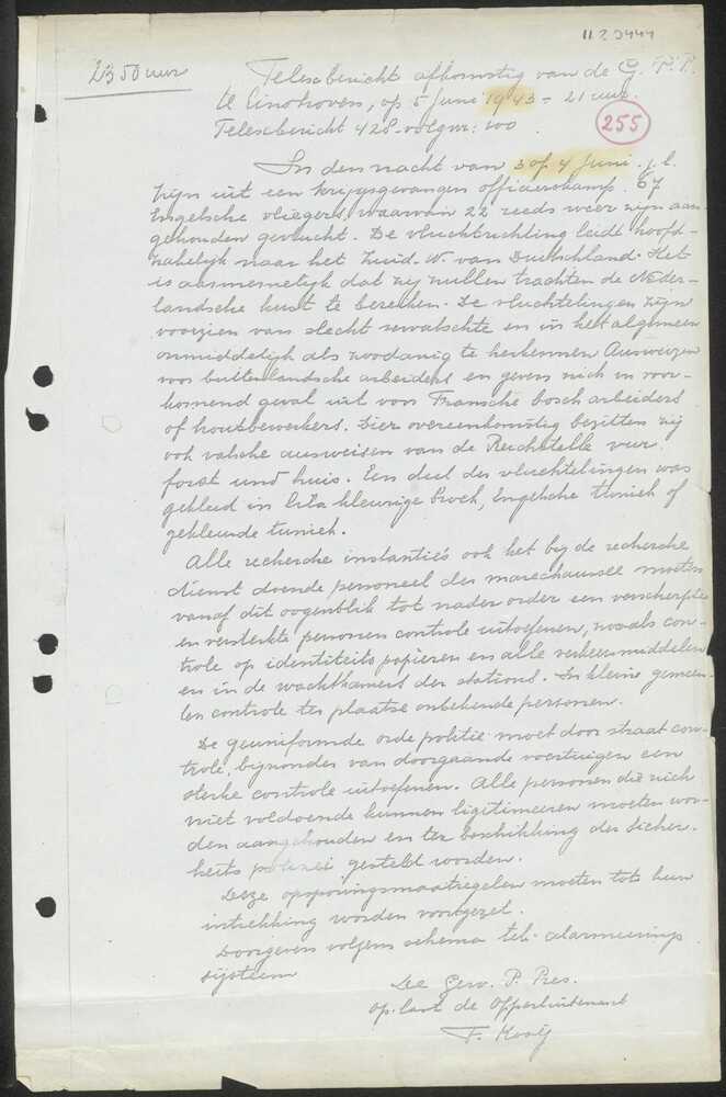 Telexbericht No. 428/100 G.P.P. Eindhoven 5 juni 1943.