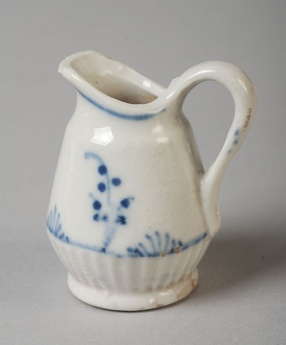 Witte miniatuur melkkan van kinderservies, met blauw...