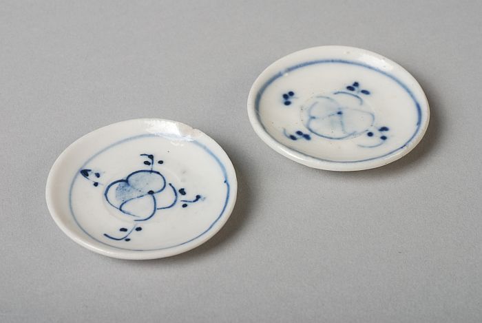 Twee witte miniatuur schotels van kinderservies, met...