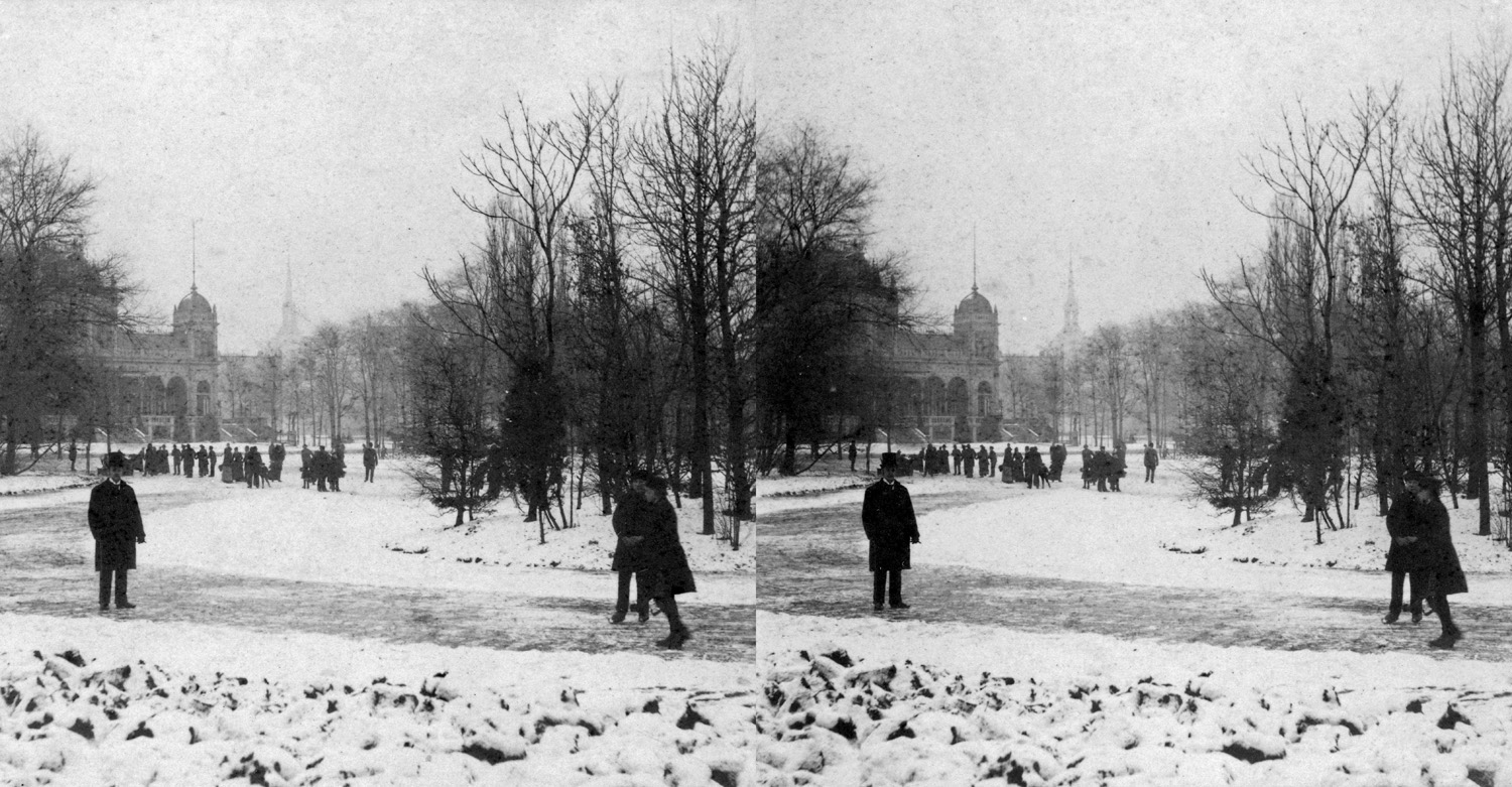 Stereokaart voorstellende een schaatsende menigte op...
