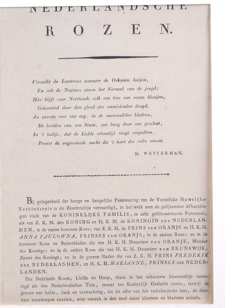 Rozen en gedicht tgv huwelijk Willem II en Anna Paulona