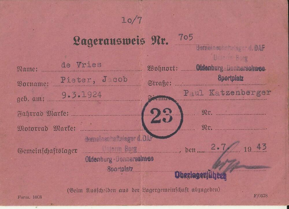 Lagerausweis op naam van Pieter de Vries