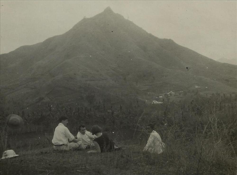Indië album; vier pesonen rustend; berglandschap Tre...