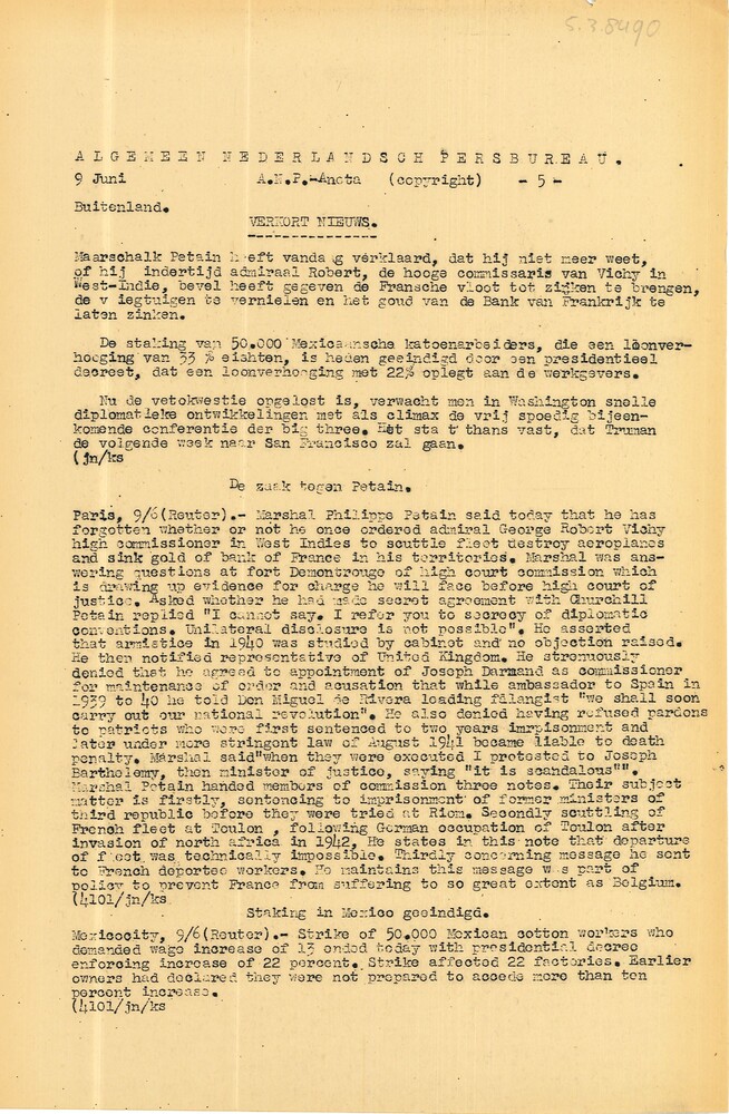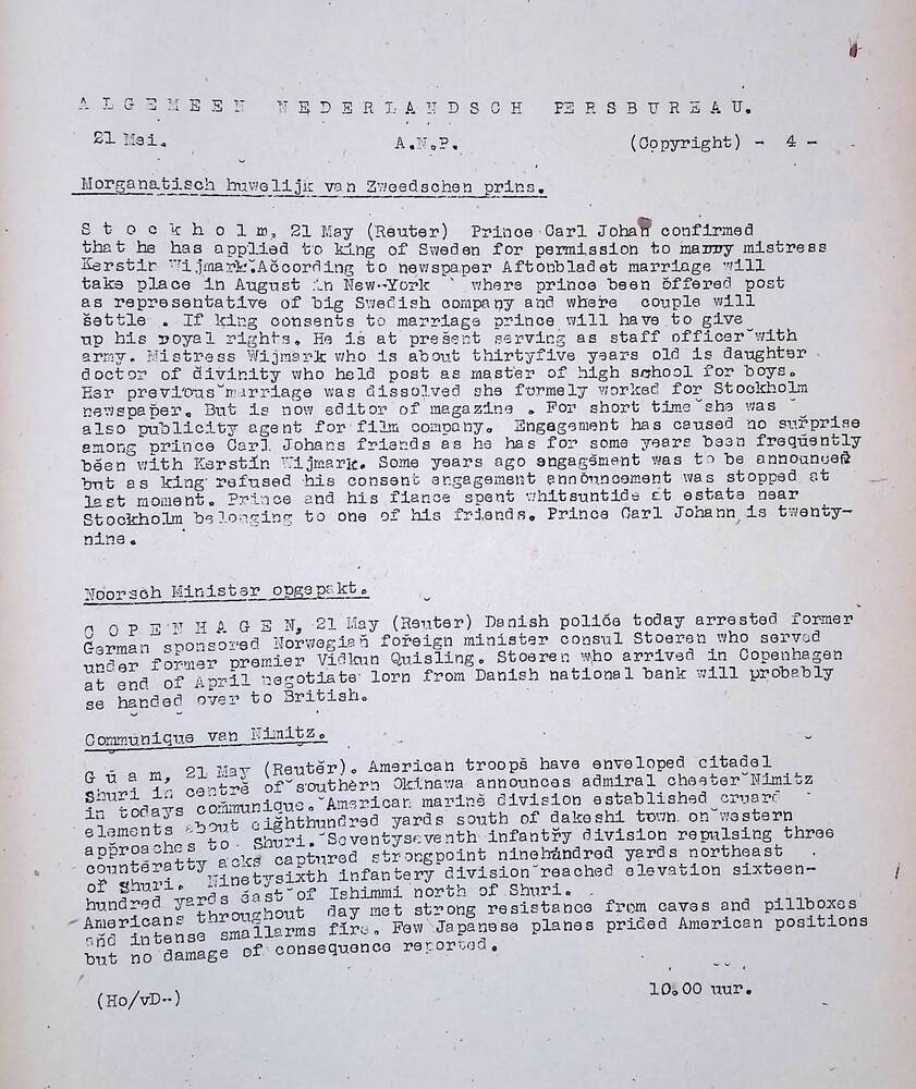 Algemeen Nederlandsch Persbureau, mededelingen, 21 m...