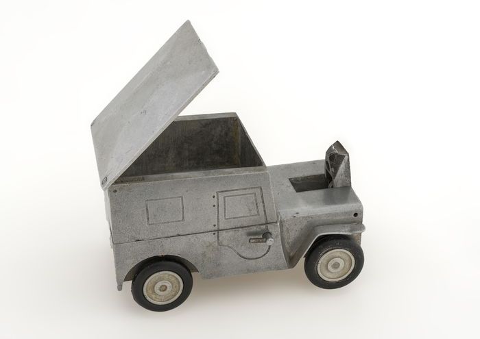 Blank metalen benzineaansteker in de vorm van een Jeep
