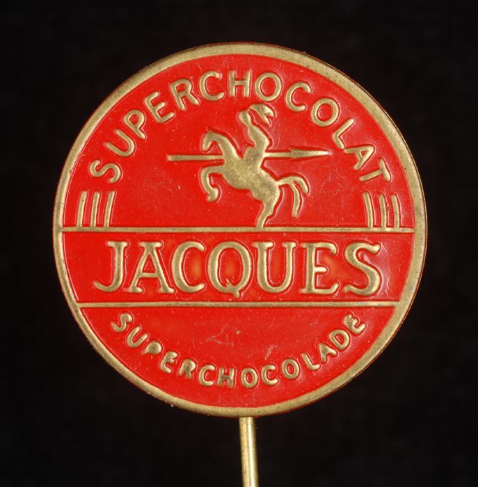 Groene reclamespeld, met in goud "Jacques, super-cho...
