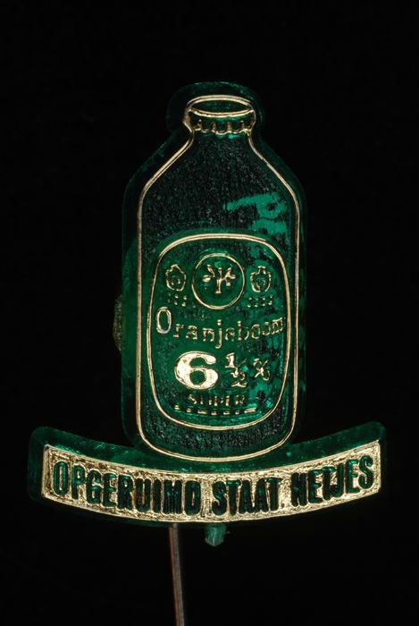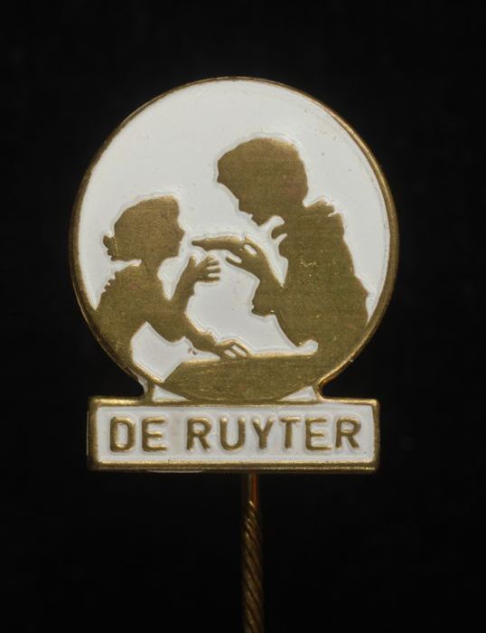 Witte en goud-kleurige reclamespeld, met "De Ruyter"...