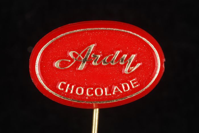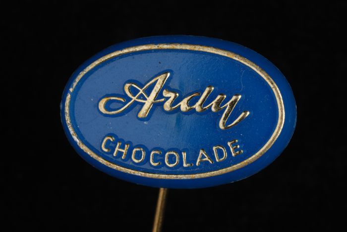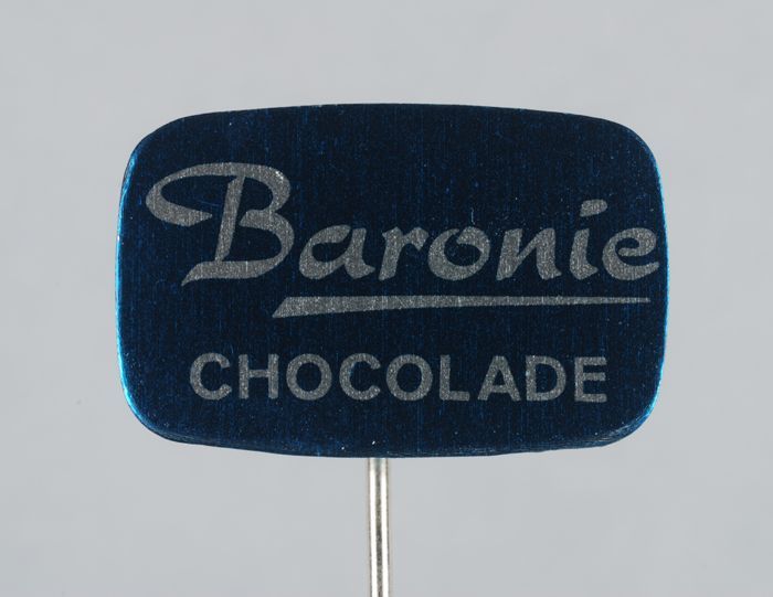 Blauwe rechthoekige reclamespeld, met "Baronie choco...