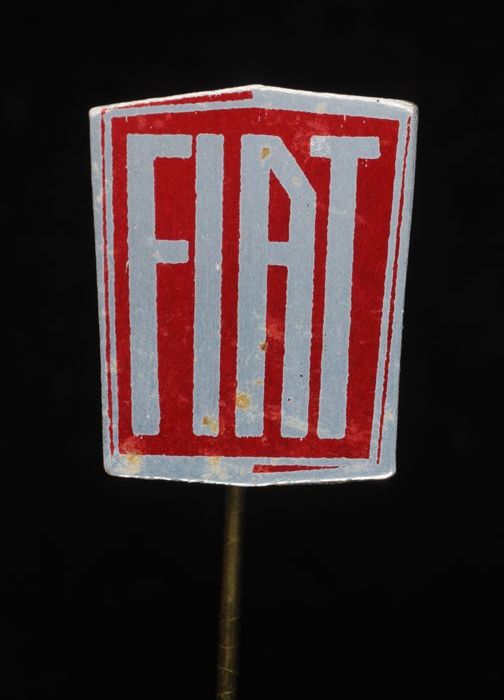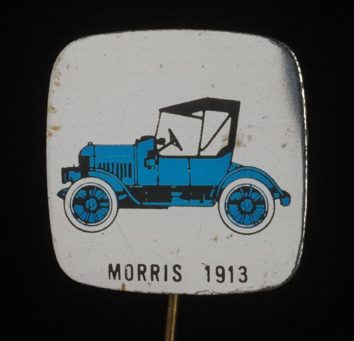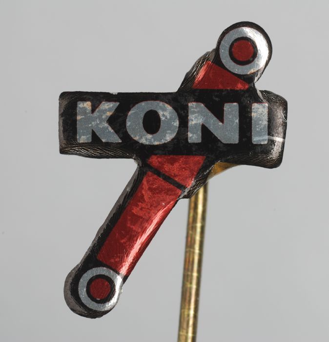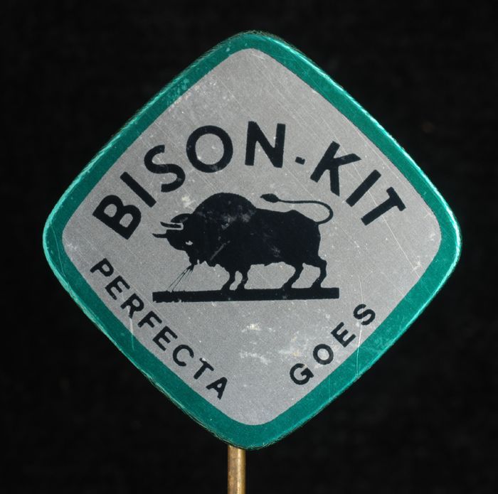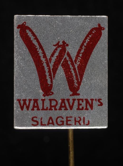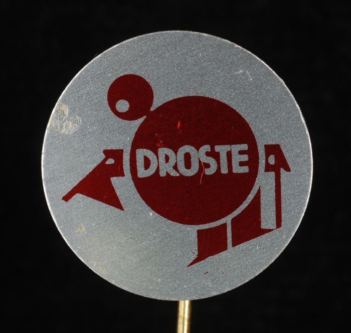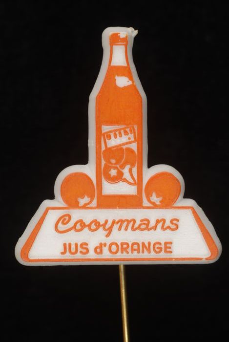 Witte rechthoekige reclamespeld, met in bruin en roo...