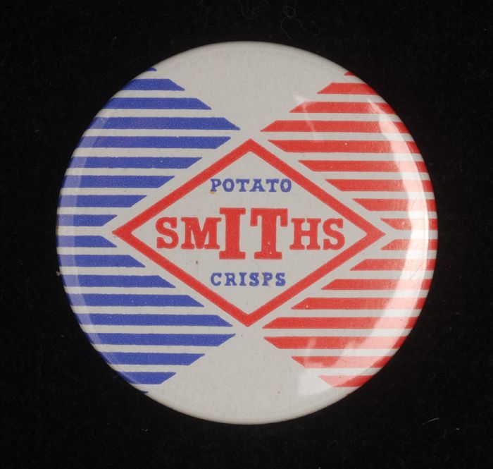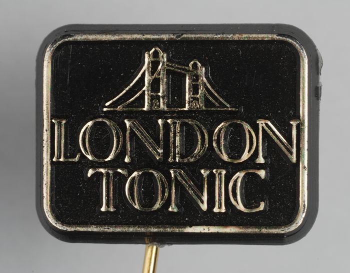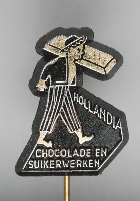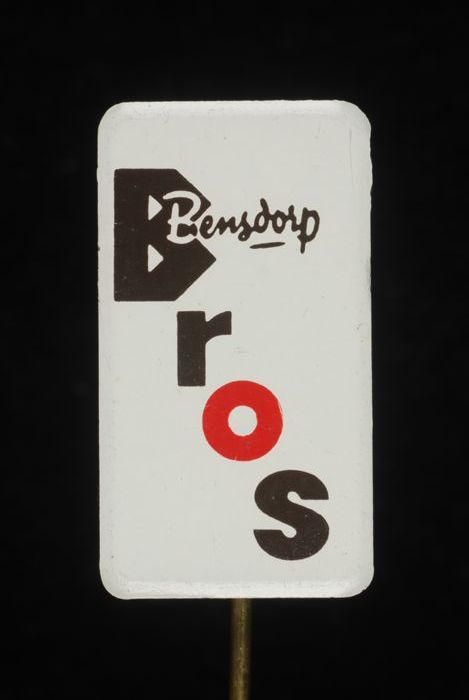Witte rechthoekige reclamespeld, met in bruin en bla...