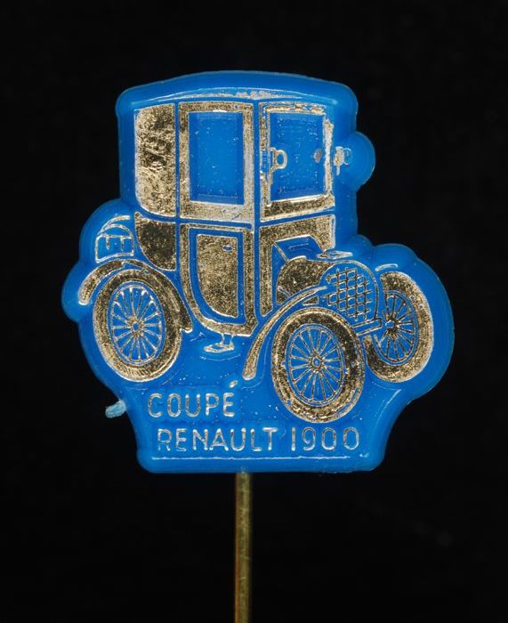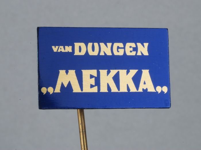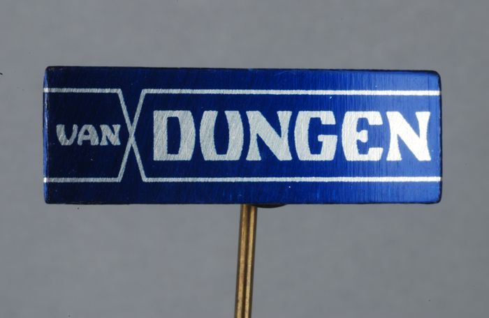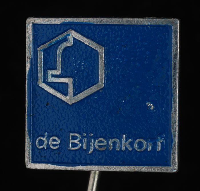 Donkerblauw rechthoekig reclamespeldje, met in goud ...
