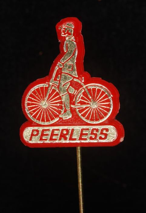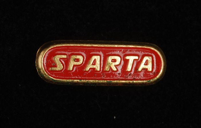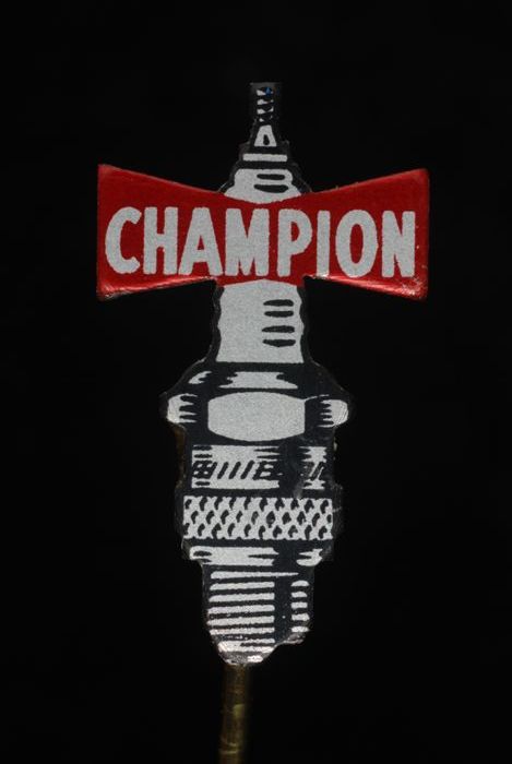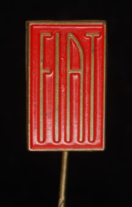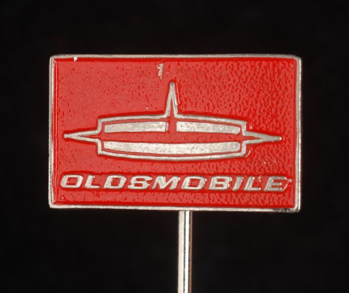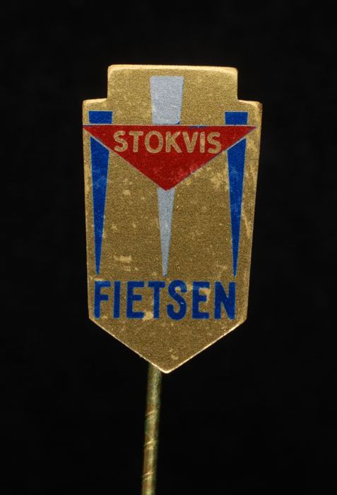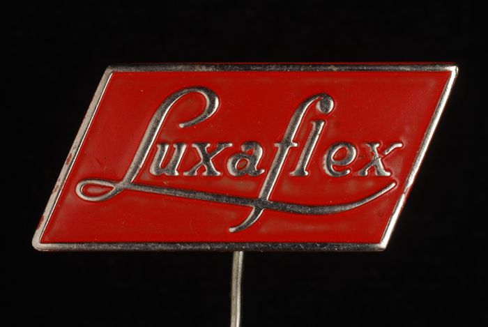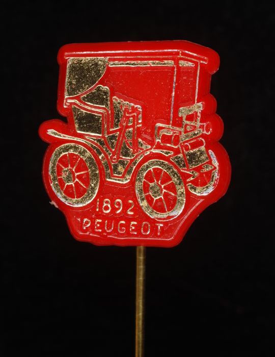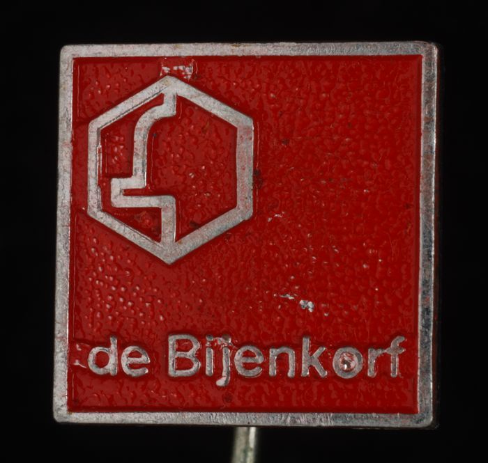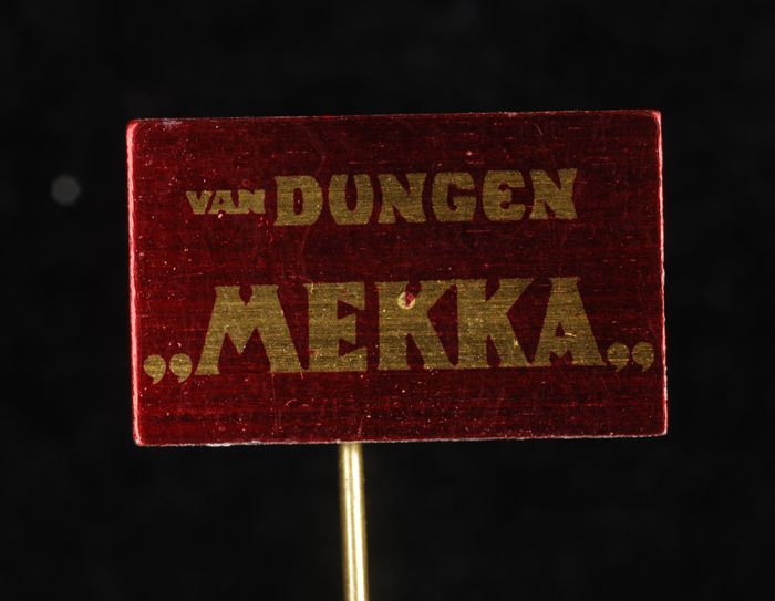 Donkerrood rechthoekig reclamespeldje, met in goud "...