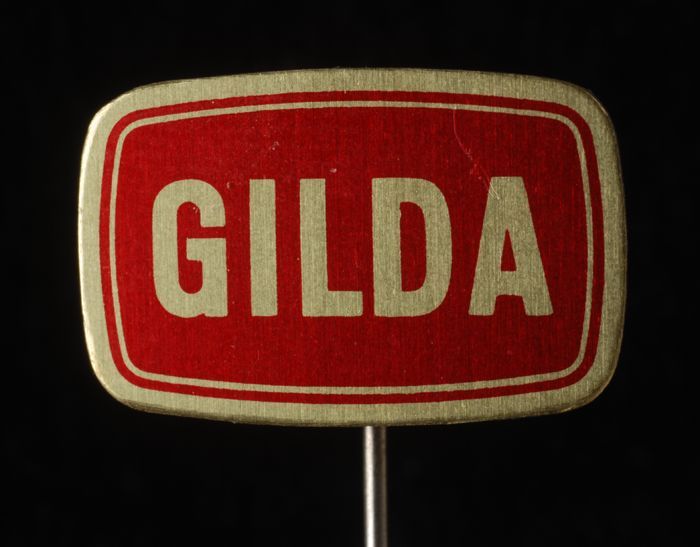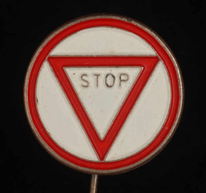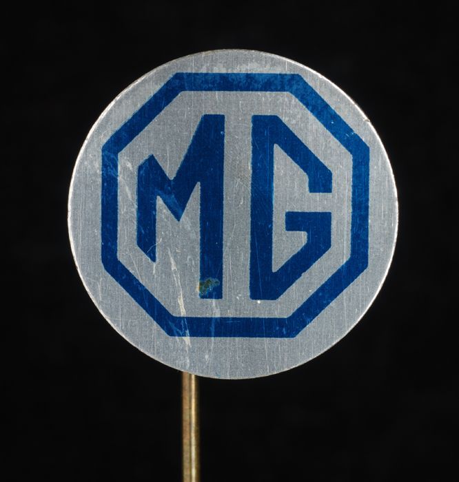 Zilverkleurige ronde reclamespeld, met in rood een g...