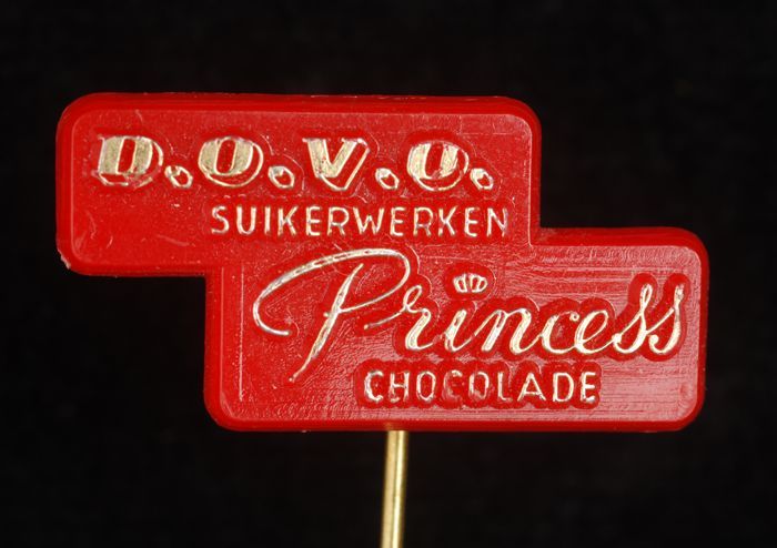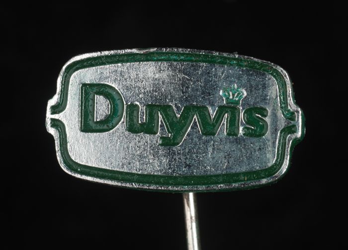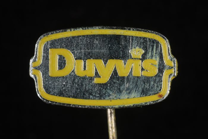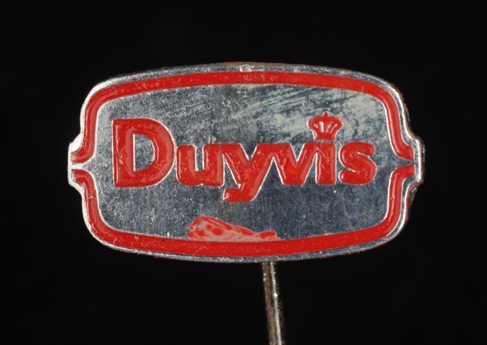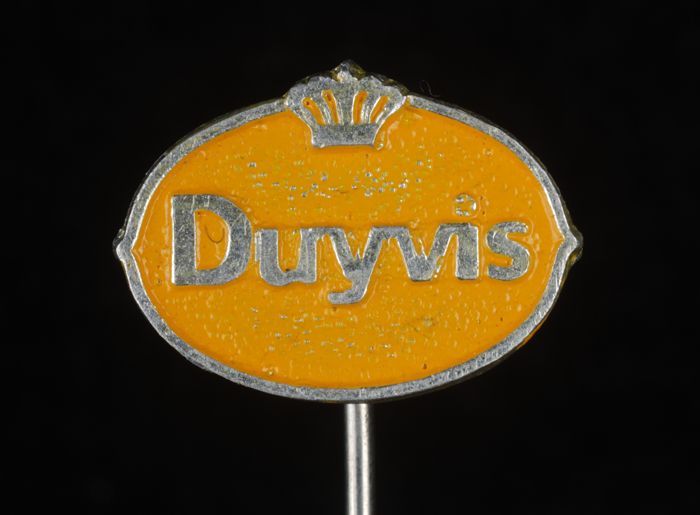 Zilverkleurig reclamespeldje, met in geel "Duyvis"