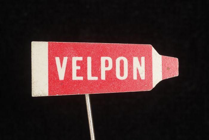 Rood en wit reclamespeldje in vorm van tube, met "Ve...