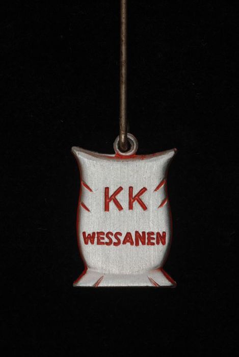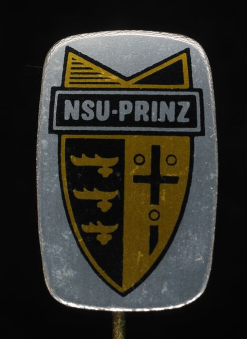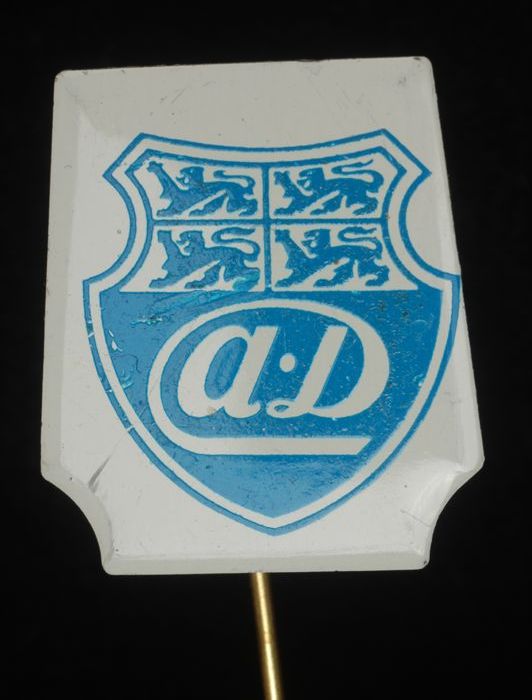 Witte reclamespeld, met blauw wapenschild waarin "aD"