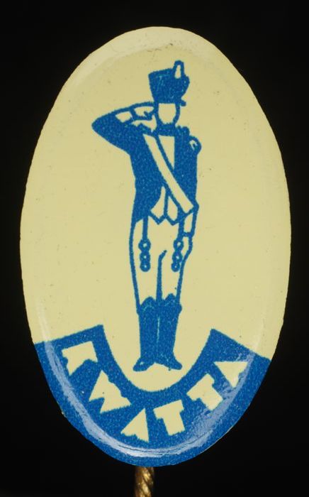 Lichtgeel en blauw ovaal reclamespeldje, met soldaat...