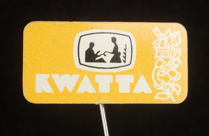 Geel rechthoekig reclamespeldje, met in wit "Kwatta"...