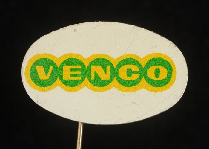 Wit en groen ovaal reclamespeldje, met in geel "Venco"
