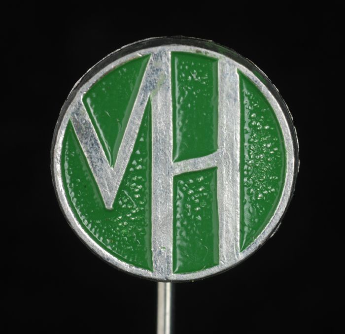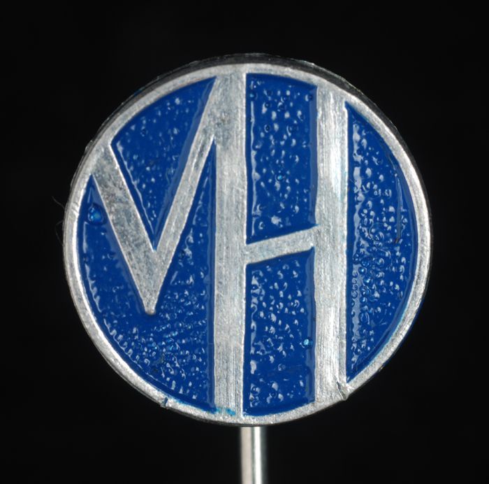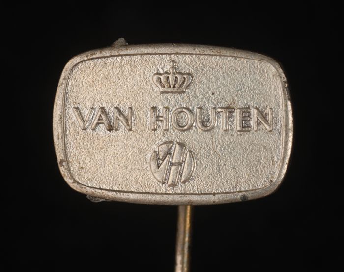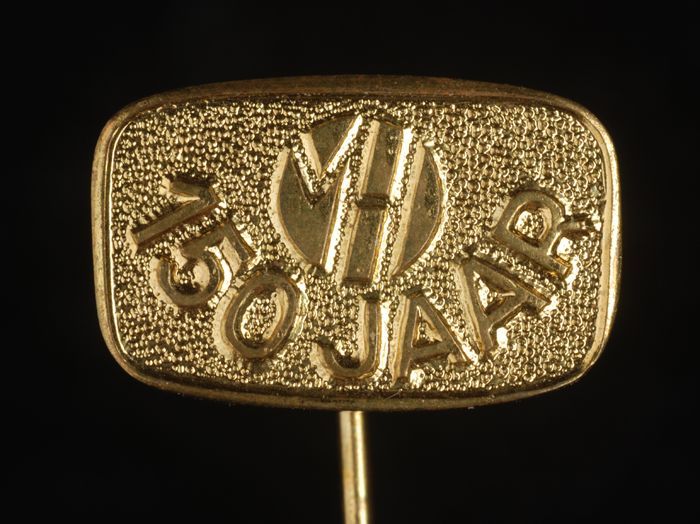 Goudkleurig reclamespeldje, met in reliëf "VH 150 jaar"