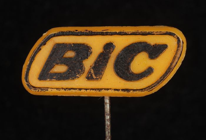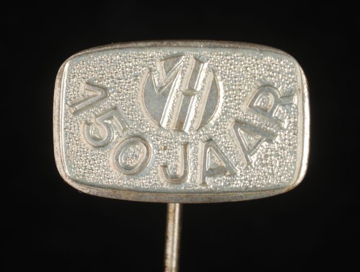 Zilverkleurig rechthoekig reclamespeldje, met in gro...
