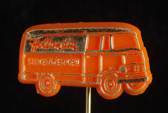 Oranje reclamespeld in vorm autobusje, waarop "Holla...