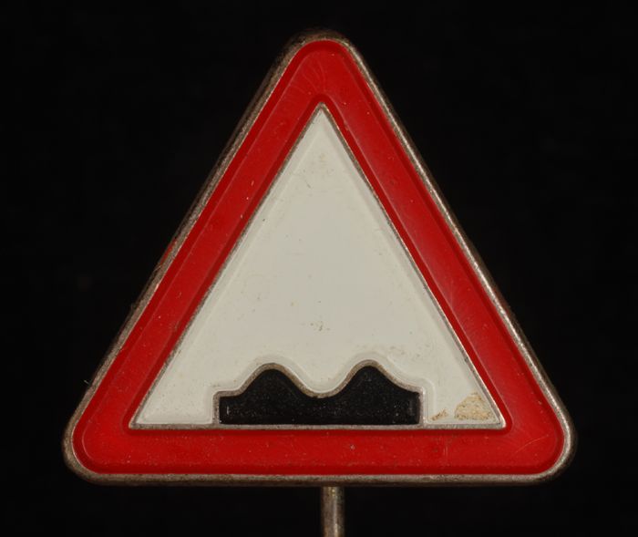 Zilverkleurig rechthoekig reclamespeldje, met in roo...