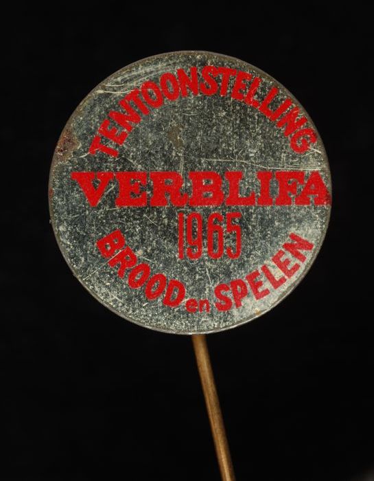 Lichtgeel en rood ovaal reclamespeldje, met soldaatj...
