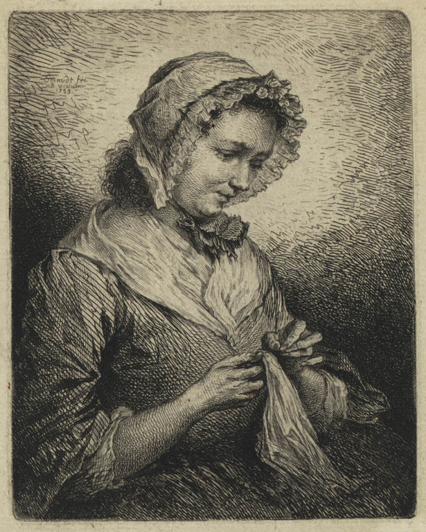 Portret Mw. Viedebandt, vrouw G.F. Schmidt, naaiend
