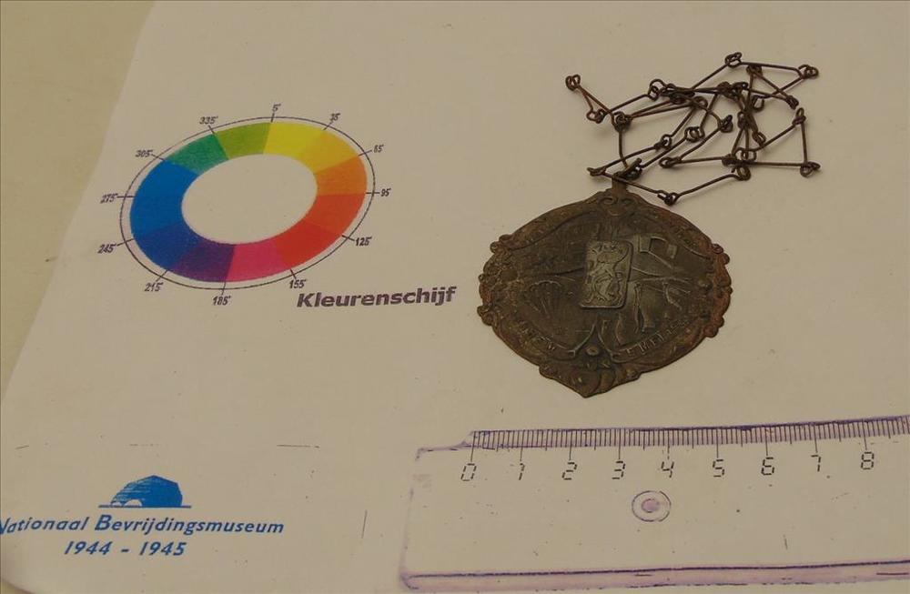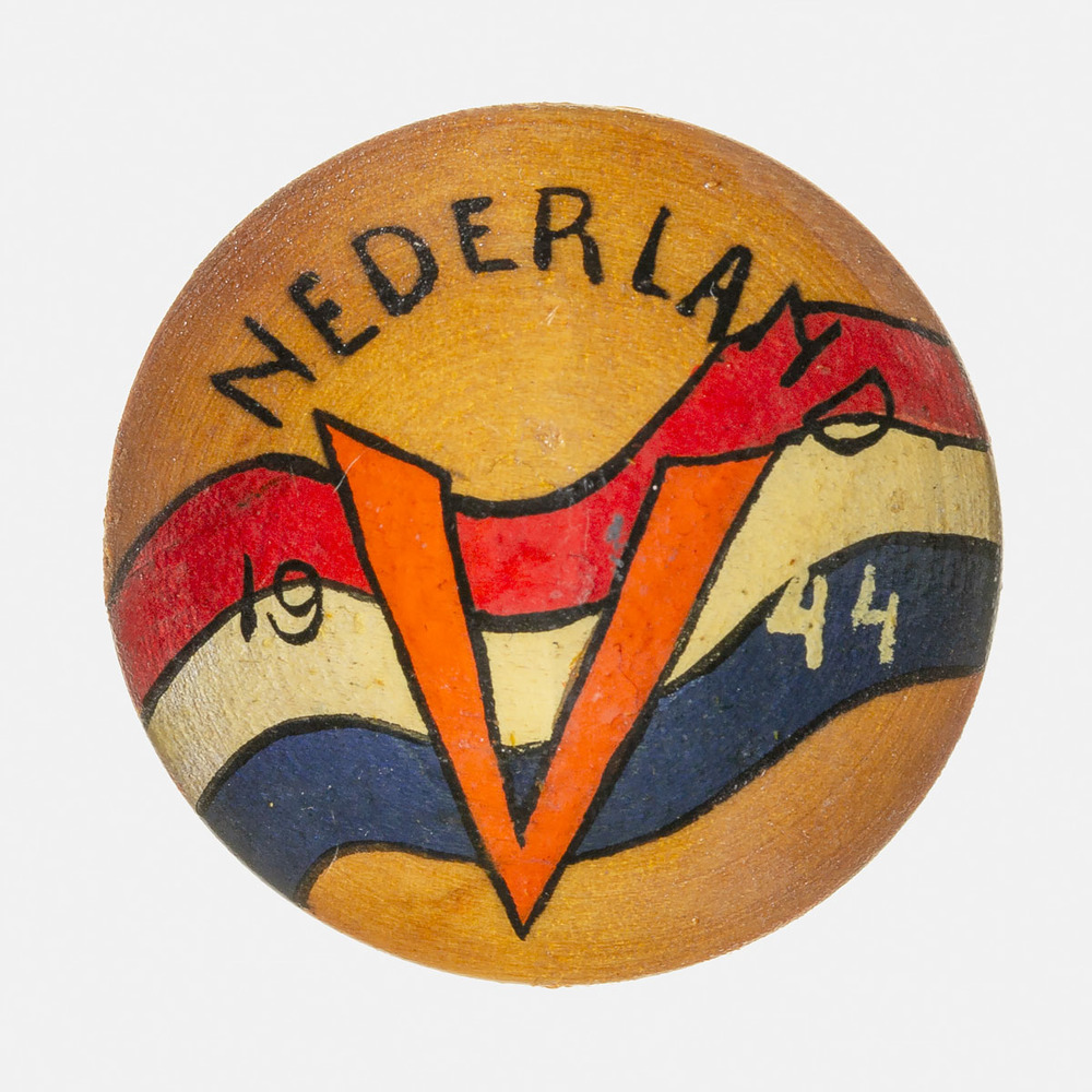 broche, hout, met daarop het V-teken en de tekst Ned...