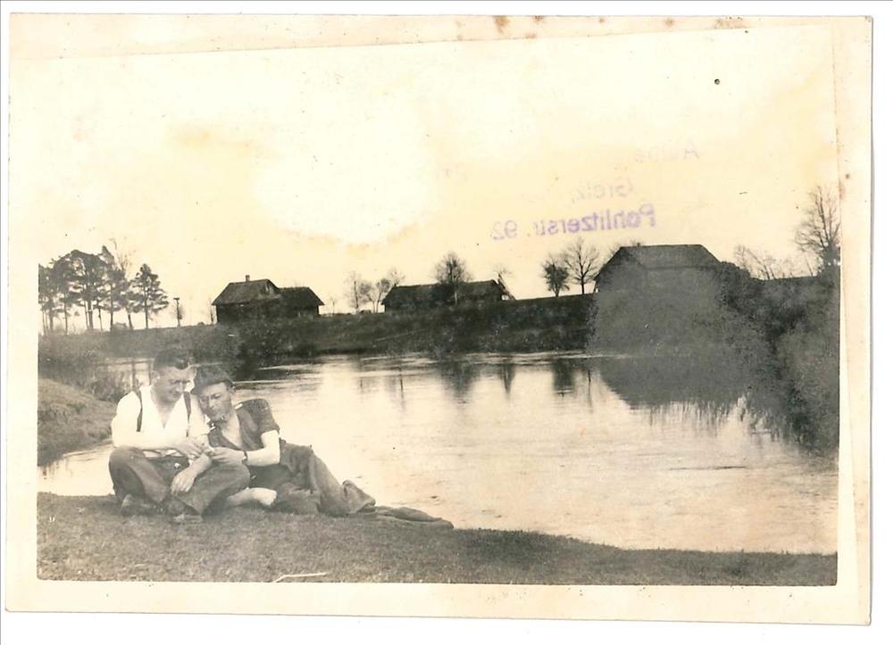 Twee Duitse soldaten zitten aan de waterkant . Op de...