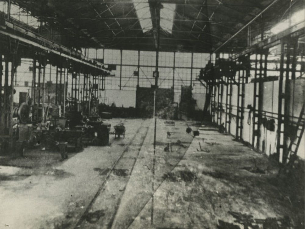 Foto van lege fabriekshal. Tekst achterop: "Wegvoere...