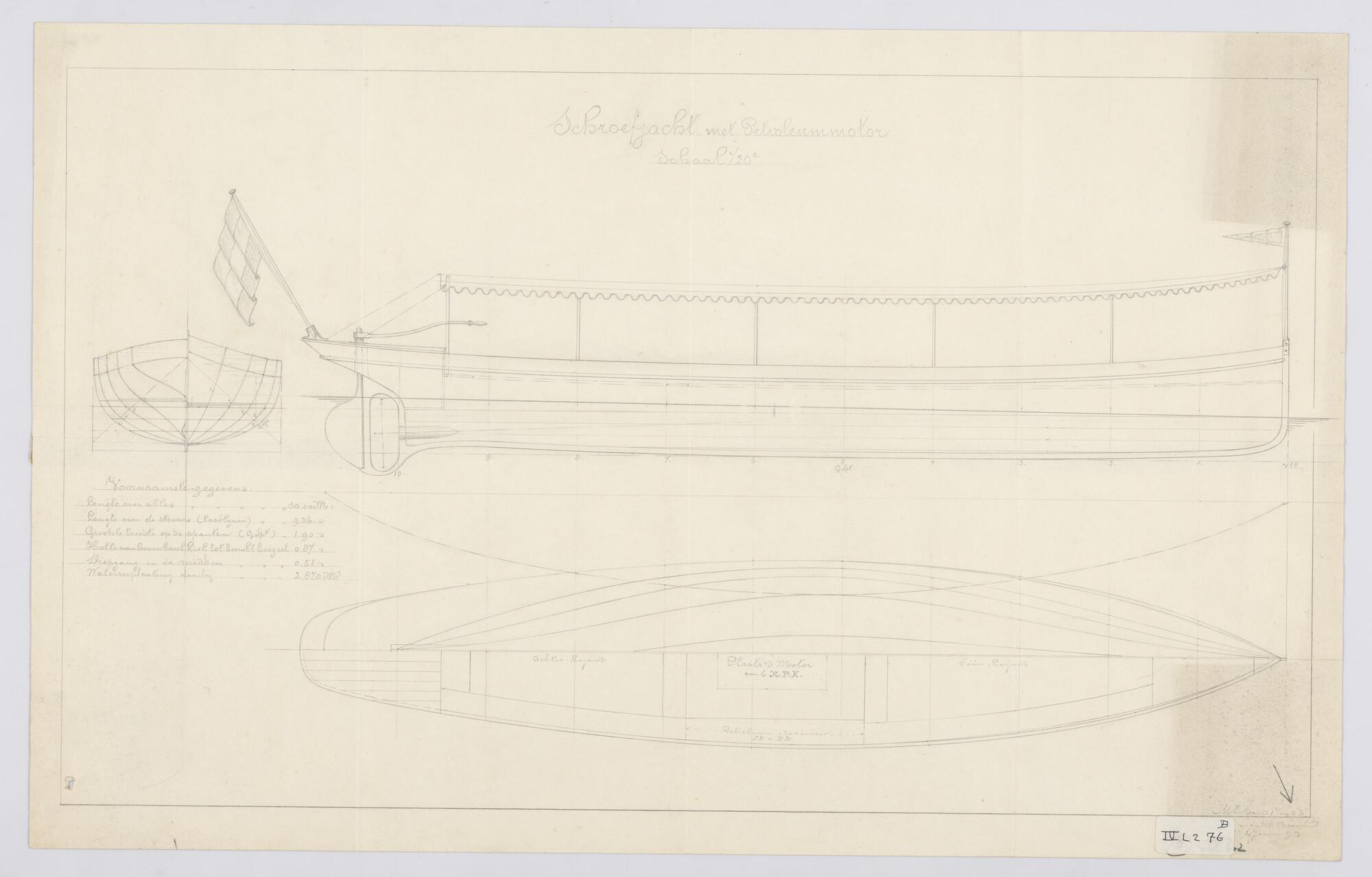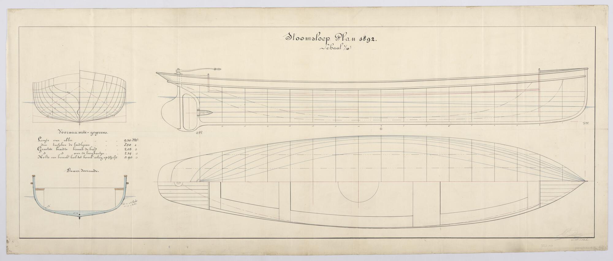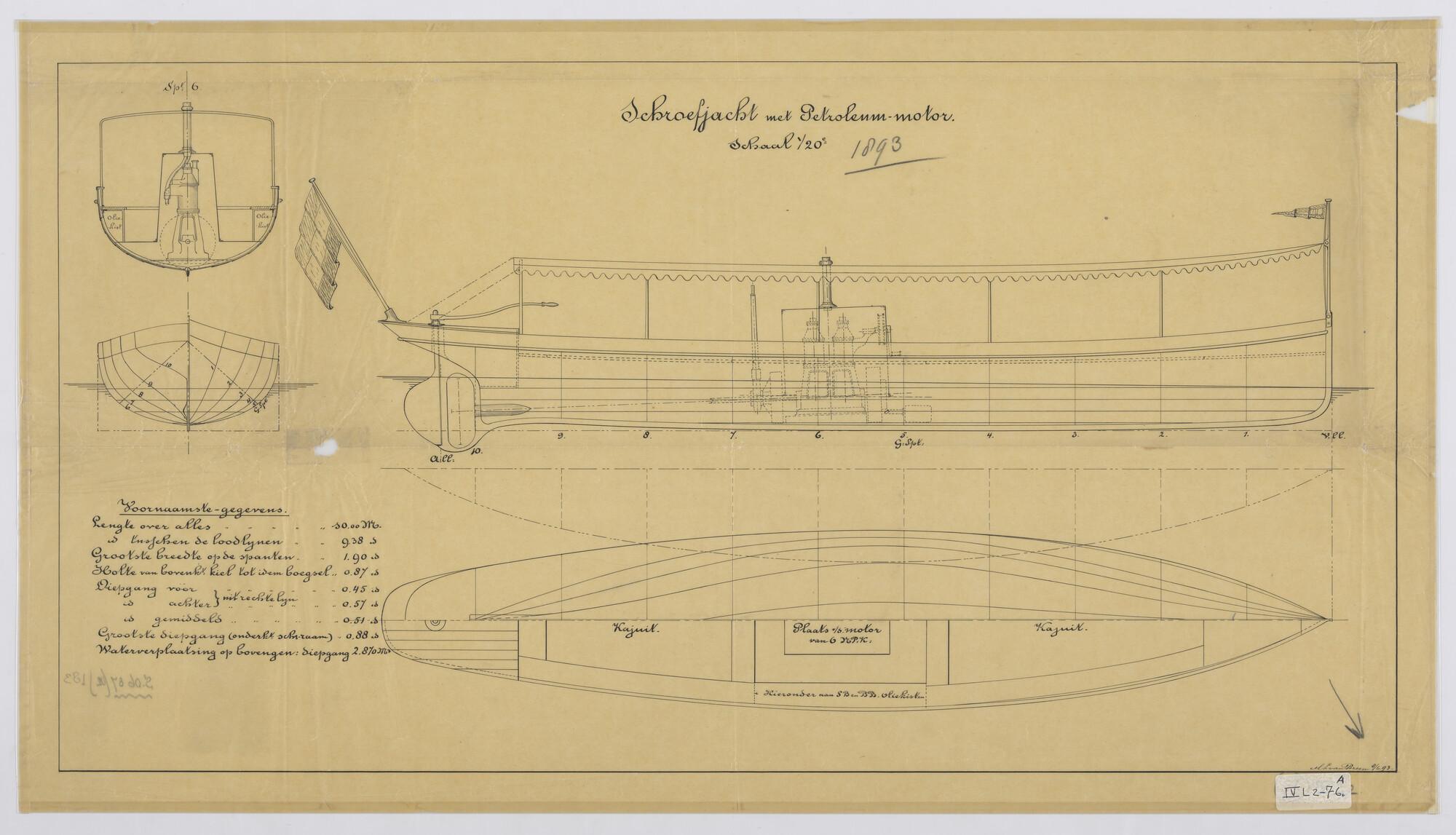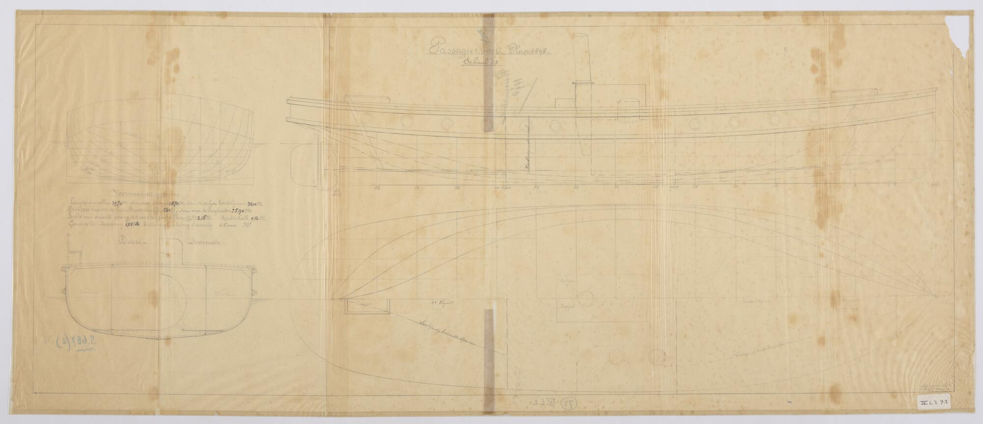 Houten stoomsloep 1892: zijaanzicht, bovenaanzicht, ...