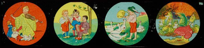 Lantaarnplaat met muziek makende kinderen en kikkers