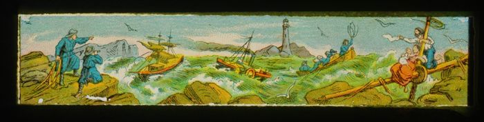 Lantaarnplaatje met stormachtige zee en schipbreuk