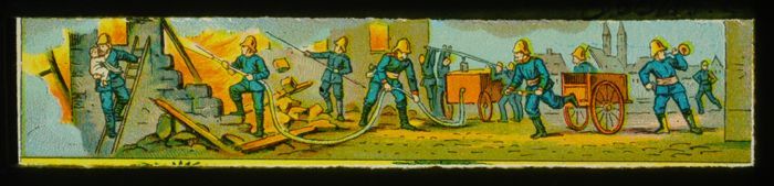 Lantaarnplaatje met brandblustafereel