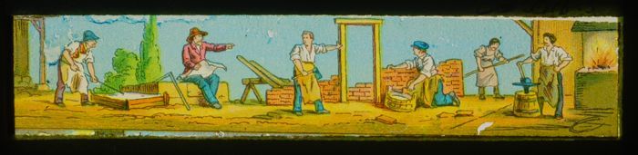 Lantaarnplaatje met bouwvakkers in actie