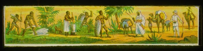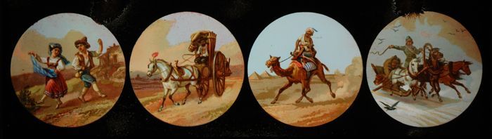 Lantaarnplaat met mensen in verre landschappen