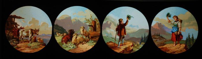 Lantaarnplaat met mensen en dieren in berglandschapp...
