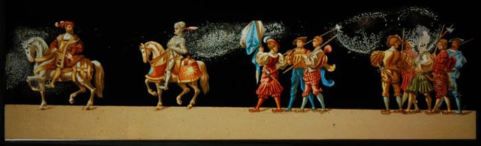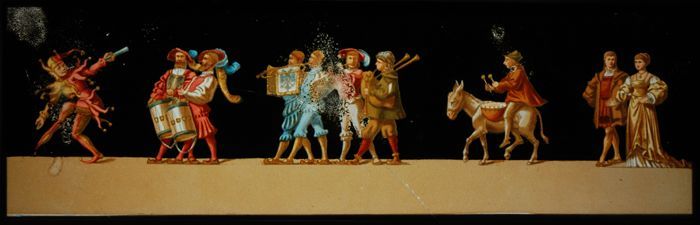 Lantaarnplaat met adellijk paar, voorafgegaan door m...