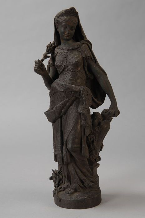 Beeld van staande vrouw in klassiek gewaad, tak in h...