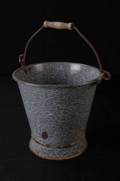 Grijs gewolkte emmer met hengsel, handvat van hout, ...