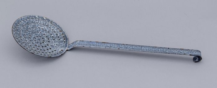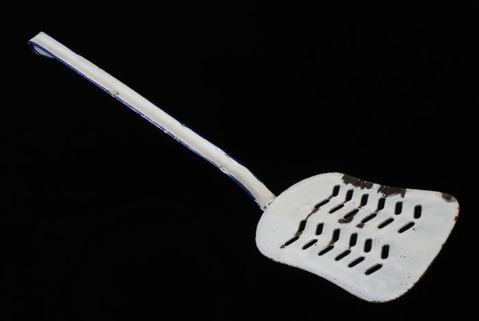 Grijs gewolkte schuimspaan, lange steel met geperfor...