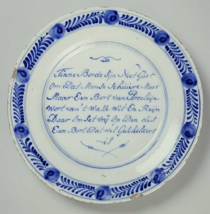 Faience bord met spreuk "Tinne Borde Sijn Niet Goet ...