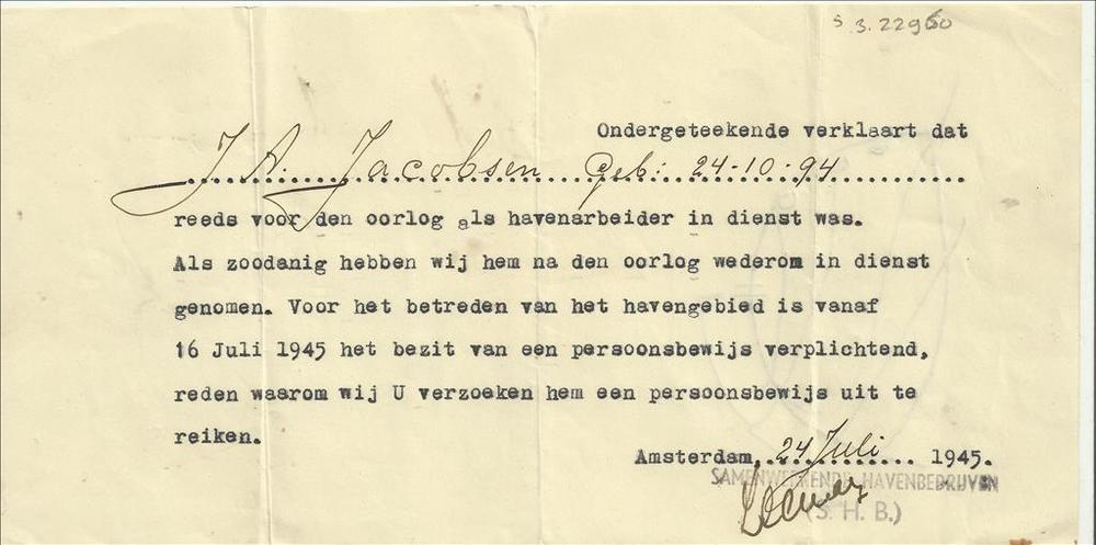 Verklaring van Arbeid, J.A. Jacobsen, 1945